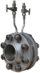 法兰取压:取压口位于孔板上下游的专用法兰上,上游取压口距离孔板端面 25.4mm,下游取压口距离孔板端面 25.4mm;结构简单,安装维护方便,适合大口径管道。